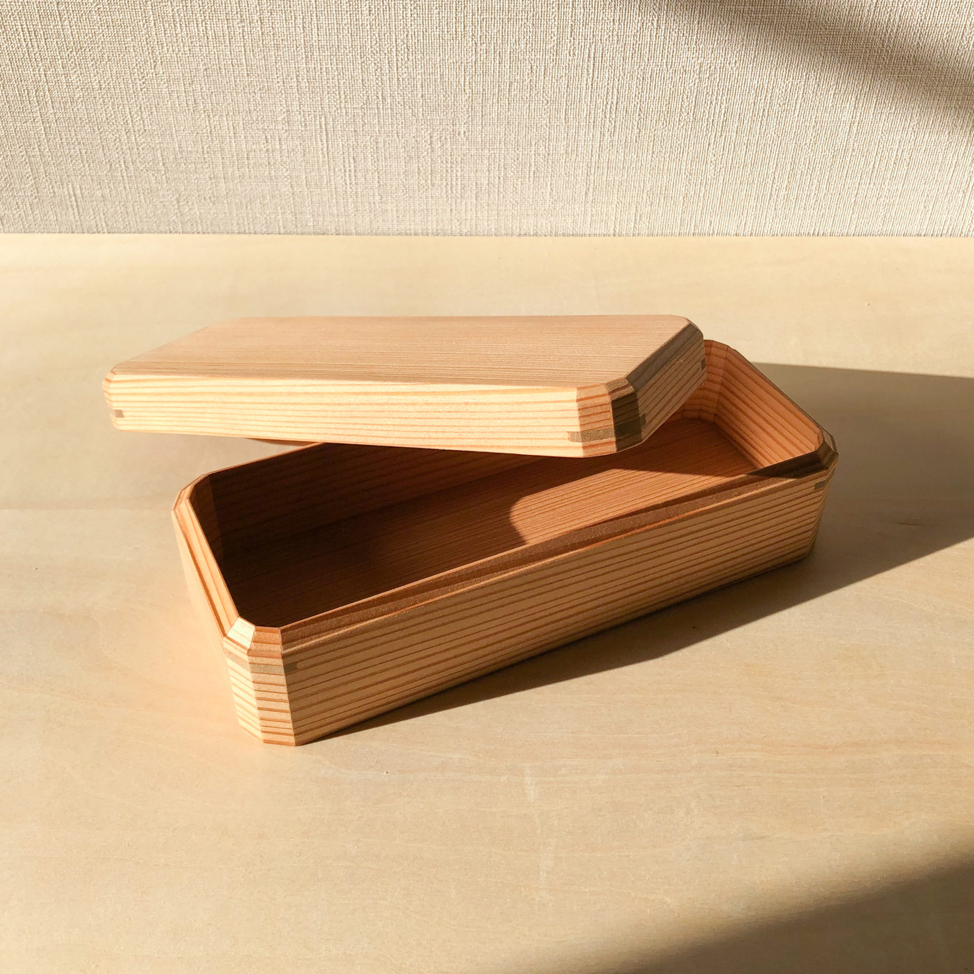 四隅に切り込みを入れ2段階に曲げることで、極力角を無くすことを試みたシンプルな杉の箱です。