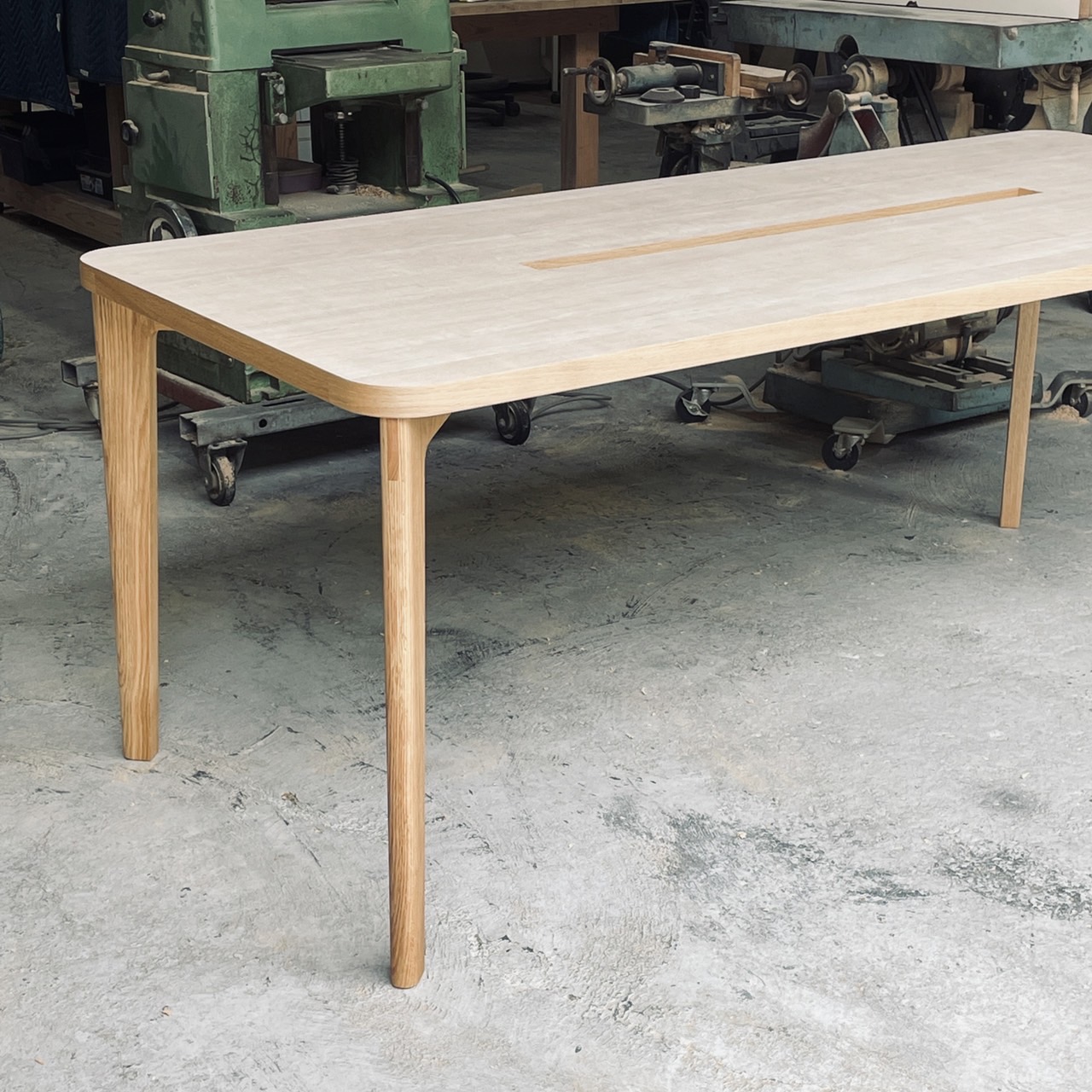 天板の中心に電源タップが収納できる仕様。天板はメラミンなので汚れをサッと落とせて機能的です。天板の角とオーク材の脚の丸みのデザインが、やわらかな印象になるよう仕上げました。※セミオーダーにて変更可能部分は、天板サイズと脚の高さです。