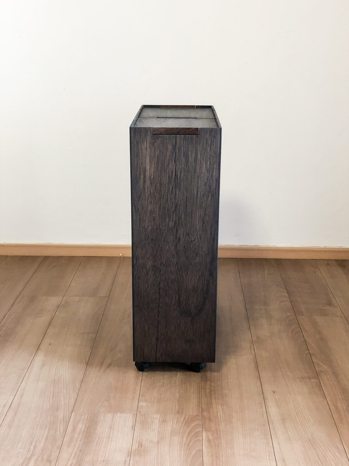 蓋の開閉を指一本で簡単にできるように、前方の蓋を後ろにスライドさせると後方の蓋が持ち上がるシンプルなからくりです。開閉時のカタカタと鳴る、子気味良い木の響きがなんだか懐かしく心地よい...